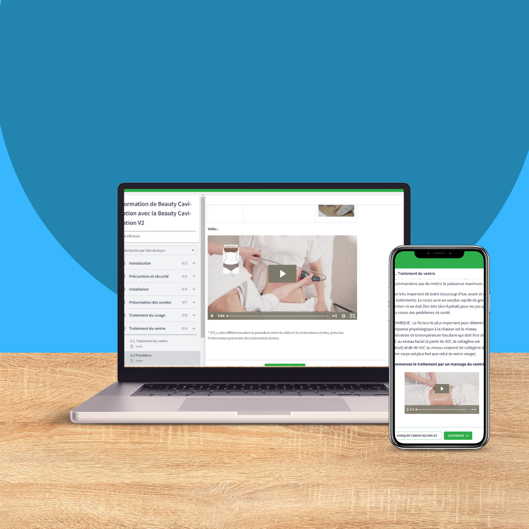 Discover our comprehensive, best-in-class online training, which gives you exclusive access to how-to videos via our professional platform. You will learn in detail how the device works, the different modes available, as well as how to use the accessories for effective treatments of the stomach, thighs and face. Our training program is distinguished by the following advantages: